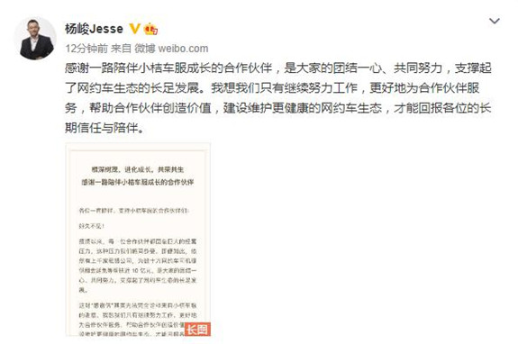 以下是滴滴出行副總裁、小桔車服副總經(jīng)理楊峻致合作伙伴的感謝信全文: