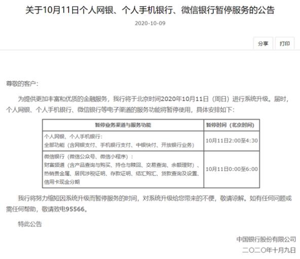 根據(jù)公告,中國銀行將于北京時間2020年10月11日(周日)進行系統(tǒng)升級。