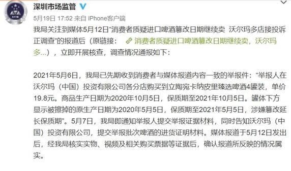 該事件曝光后沃爾瑪下屬門店對(duì)舉報(bào)批次啤酒進(jìn)行召回,深圳市監(jiān)局對(duì)全市范圍所有沃爾瑪門店開展現(xiàn)場(chǎng)檢查。經(jīng)檢查,全市沃爾瑪門店已于5月11日應(yīng)沃爾瑪(深圳)總部要求,對(duì)涉事產(chǎn)品全部作下架處理,現(xiàn)場(chǎng)未發(fā)現(xiàn)有涉事產(chǎn)品在售。