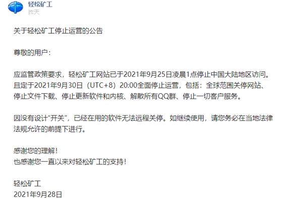 只不過輕松礦工現(xiàn)在面臨的壓力也很大,最終決定終止運營,官方網(wǎng)站已經(jīng)發(fā)表公告,表示監(jiān)管政策要求,輕松礦工網(wǎng)站已于2021年9月25日凌晨1點停止中國大陸地區(qū)訪問。