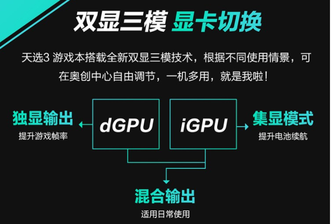 首先給不太清楚的小伙伴們科普一下,“雙顯三模”顯卡切換的作用是允許用戶根據(jù)筆記本使用的場景進(jìn)行顯卡模式切換,雙顯指有獨(dú)顯、集顯兩塊顯卡,而三模是指針對(duì)這兩塊顯卡,系統(tǒng)可以提供三種不同的模式調(diào)用,分別有獨(dú)顯輸出、混合輸出以及集顯模式三種模式。