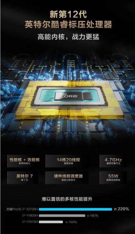 第12代標壓處理器i7-12700H采用性能核+效能核新異構核心,擁有14核20線程的超強規(guī)模,其極致功耗釋放可以達到85W,綜合性能對比上一代提升高達220%。即使進行復雜的視頻處理,依然能保持飛一般的流暢快感,肆意揮灑靈感,保證創(chuàng)作效果的同時極大地提升工作效率。