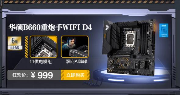 此外,若沒有無線需求,可選擇不帶WiFi 6無線網(wǎng)卡的華碩B660重炮手D4主板,價格更親民。開門紅秒殺價不高于949元,同樣12期免息。購買鏈接:https://item.jd.com/100031223666.html