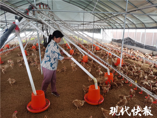 毗鄰磚橋社區(qū)大米加工廠的,是一座建成于2018年的生態(tài)牧場(chǎng)。7月16日下午,在牧場(chǎng)大棚里,年逾五旬的村民石太鳳照看著剛滿28天的雞仔,按時(shí)給它們添水補(bǔ)充飼料。借助智能調(diào)節(jié)氣溫和水溫的自動(dòng)化設(shè)備,這1.5萬只小雞不需要花費(fèi)太多的精力照料。經(jīng)過90天的標(biāo)準(zhǔn)生長周期,這批肉雞就能出欄了。