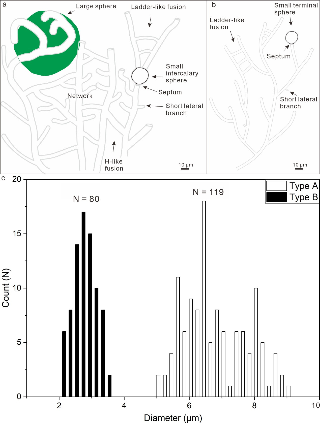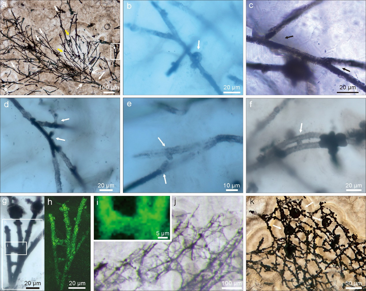 “我們發(fā)現(xiàn)6.3億年前的這種遠古真菌類化石主要由兩部分構成。一部分是長度數百微米的空心細絲,另一部分是連接在細絲之間、直徑10至26微米的空心小球。”研究團隊通過與現(xiàn)代類似真菌的比對推測,細絲可能是真菌類生物的菌絲,而空心小球可能是用于繁殖的無性孢子。
