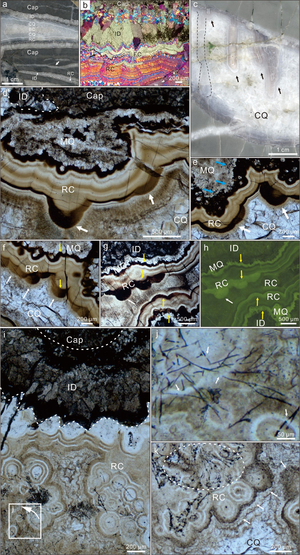 △席狀孔洞的巖石薄片顯微觀察,顯示不同期次的膠結物與真菌狀微體化石