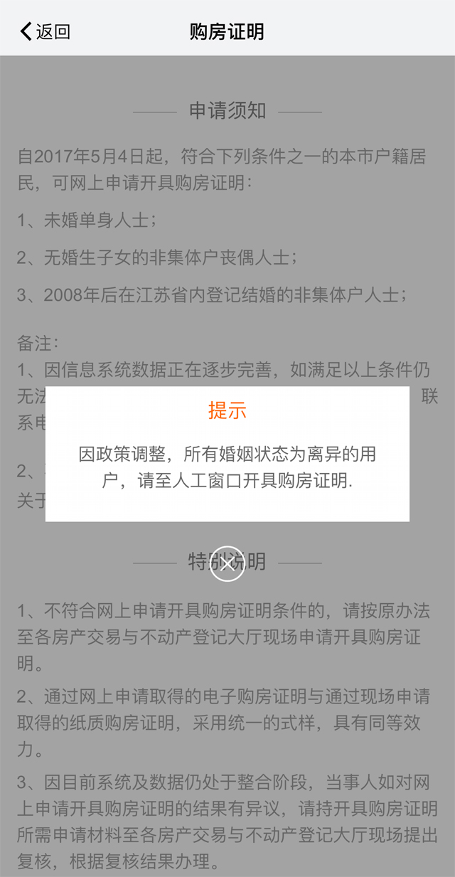 根據(jù)新政中進(jìn)一步完善住房限購政策的規(guī)定,夫妻離異的,任何一方自離異之日起兩年內(nèi)購買商品住房的,其擁有住房套數(shù)按離異前家庭總套數(shù)計(jì)算。23日,現(xiàn)代快報記者打開“我的南京”購房證明開具模塊時,系統(tǒng)彈出提示:“因政策調(diào)整,所有婚姻狀態(tài)為離異的用戶,請至人工窗口開具購房證明。”
