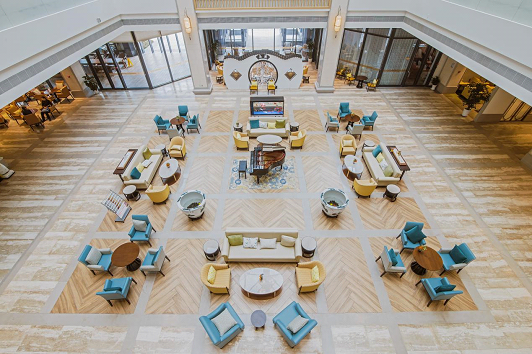 吳園在建筑風(fēng)格上融入了蘇州特有的園林式景觀設(shè)計(jì),隨處可見的白墻青瓦、茶園迷宮、假山疊瀑、風(fēng)雨連廊。會(huì)所的活動(dòng)區(qū)明媚淡雅,美勒森團(tuán)隊(duì)在產(chǎn)品的風(fēng)格設(shè)計(jì)上也圍繞泰康吳園的空間主基調(diào),將傳統(tǒng)的蘇式韻味融入到產(chǎn)品的每個(gè)細(xì)節(jié); 在產(chǎn)品上采用不同形式的沙發(fā)組合和休閑桌椅組合,為寬敞明快的大堂增添了更多的變化和功能。