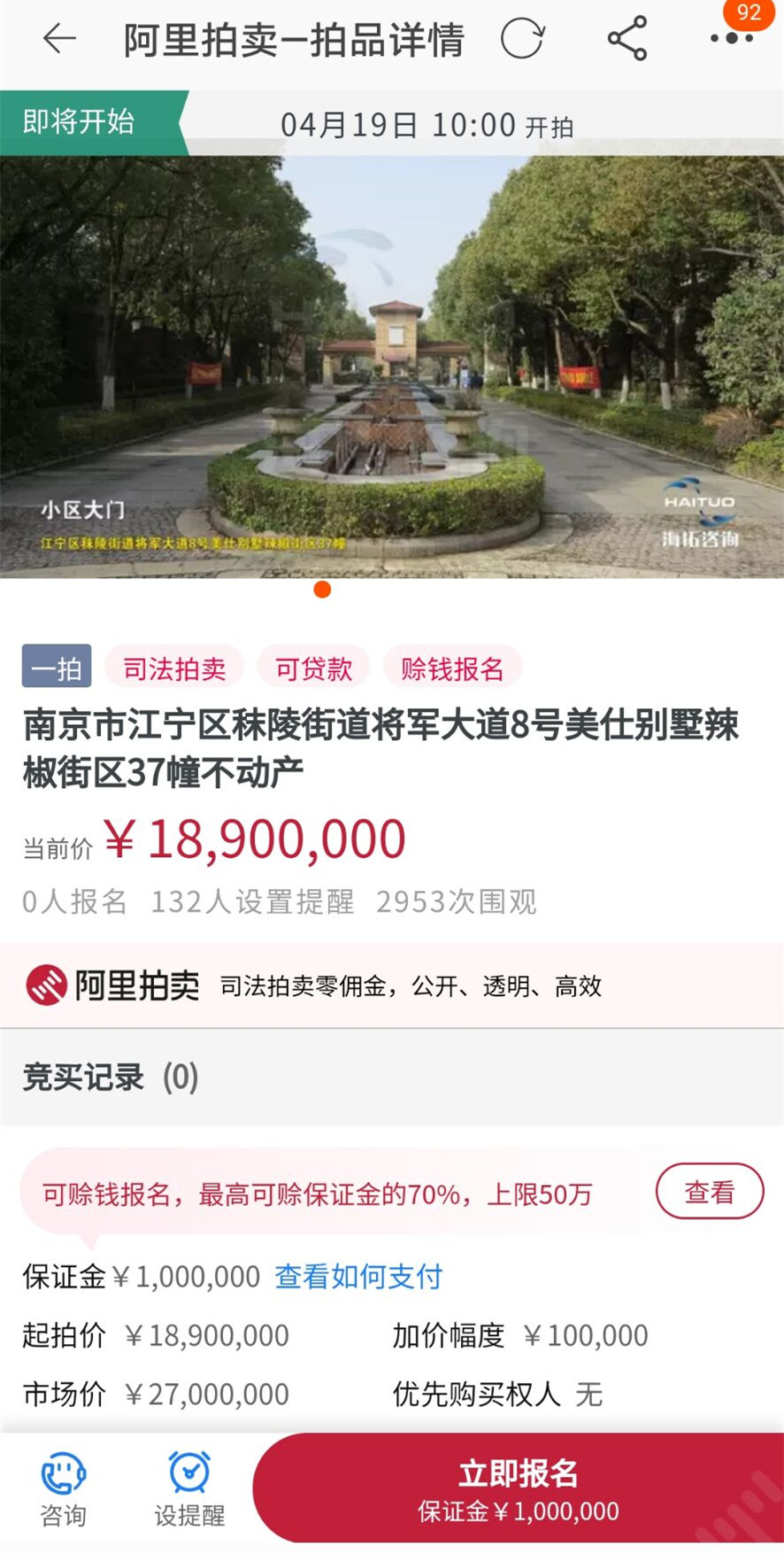 據(jù)了解,南京市秦淮區(qū)人民法院將于2021年4月19日上午10點到2021年4月20日上午10點在阿里拍賣平臺進(jìn)行公開拍賣,起拍價為1890萬元,保證金為100萬元,加價幅度為10萬元。