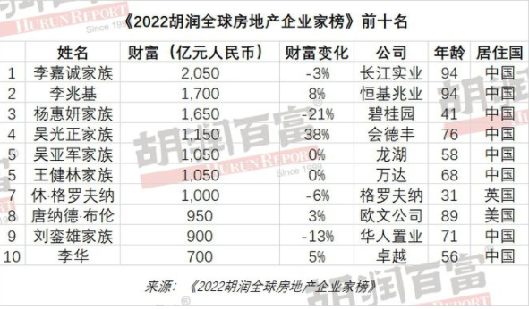 4月6日,胡潤研究院發(fā)布《2022胡潤全球房地產(chǎn)企業(yè)家榜》。榜單顯示,前十名上榜門檻為700億元,8位來自中國,其中香港首富長江實業(yè)94歲的李嘉誠以2050億元的財富成為全球房地產(chǎn)首富;恒基兆業(yè)94歲的李兆基以1700億元排名第二;碧桂園41歲的楊惠妍以1650億元排名第三。