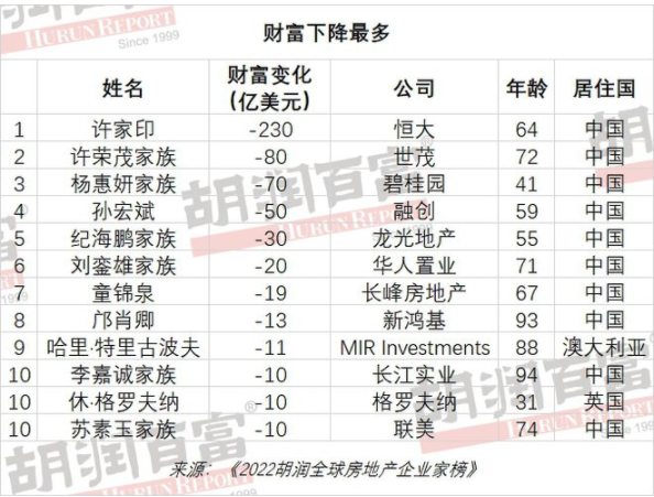 36位房地產(chǎn)企業(yè)家財富比去年下降,其中中國占三分之二(24位),財富下降最多的是恒大64歲的許家印,減少了1500億元。