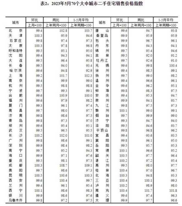 2023年5月70個大中城市二手住宅銷售價格指數(shù)。 截圖自國家統(tǒng)計局官網(wǎng)
