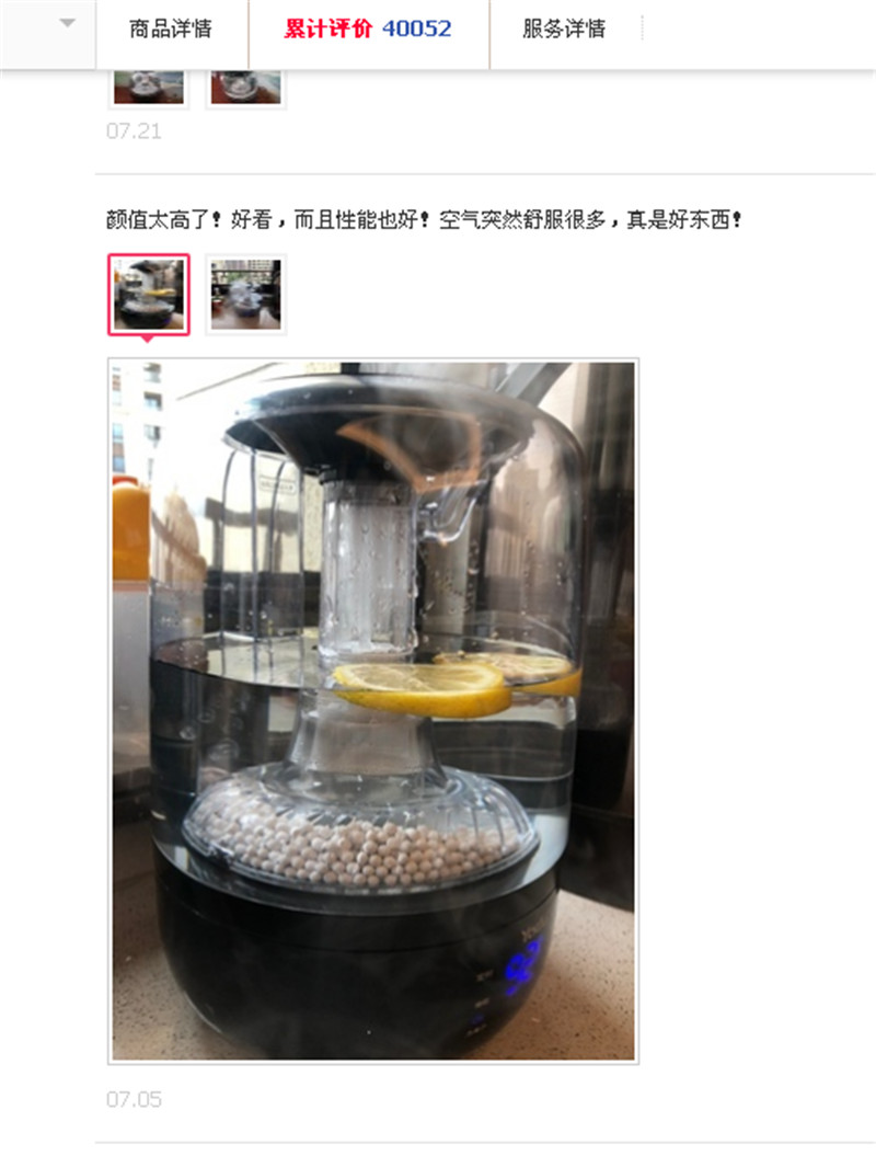 在某電商品牌,其熱銷(xiāo)的一款加濕器在商品描述中寫(xiě)道:可以添加花果,清新的花果香充滿房間,緩解精神疲勞??头嬷浾撸恍枳⒁夥胖脮r(shí)間,不超過(guò)4個(gè)小時(shí),防止加入物品腐爛變質(zhì)。目前這款加濕器月銷(xiāo)量有979件,在評(píng)論區(qū),不少消費(fèi)者都貼出了放入檸檬、花瓣等物質(zhì)的買(mǎi)家秀。