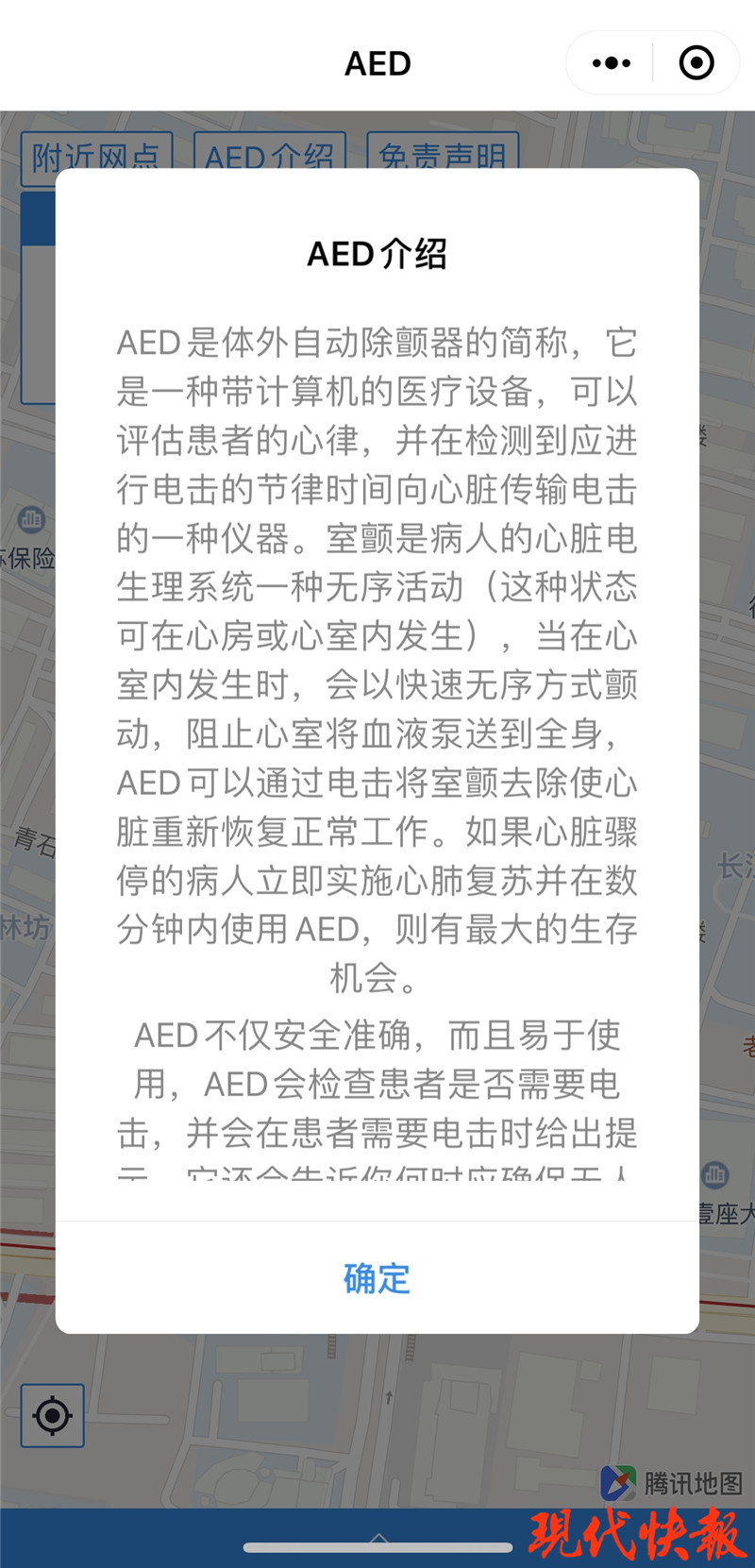 據(jù)了解,2019年4月,江蘇省衛(wèi)健委公布了“AED分布地圖”,公眾一旦有需要,可直接在騰訊、百度地圖等搜索“AED”,或者在微信、QQ的“城市服務”里快速查找附近設置的AED?,F(xiàn)代快報記者在長江路附近,打開手機里一款導航APP,在搜索框里輸入“AED”,立刻搜索出10多個AED位置,最近的相距519米,最遠的相距14.4公里。
