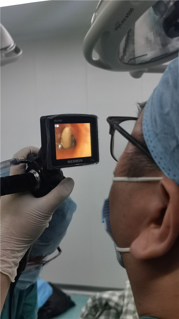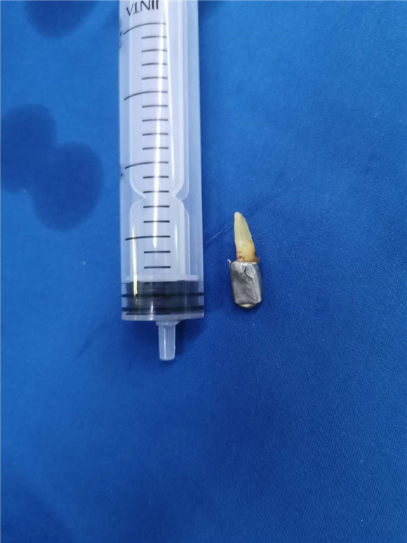 當(dāng)天下午手術(shù)正式開始,電子支氣管鏡順利進(jìn)入患者氣道,發(fā)現(xiàn)假牙嵌頓于右主支氣管,右肺通氣功能幾近喪失。在劉盼盼的協(xié)助下,楊旸用異物鉗夾住假牙尖端,假牙有松動(dòng)但無法直接鉗出。隨后決定更換圈套器,圈住假牙的中間部位,收緊圈套器固定住假牙,將假牙與氣管套管一起取出。最后,楊旸使用電子支氣管鏡二次進(jìn)入氣道,見假牙嵌頓處已有肉芽組織生成,給予鏡下清理肉芽組織和分泌物后退鏡結(jié)束操作,整個(gè)操作過程不超過五分鐘。復(fù)蘇后,患者呼吸困難得到顯著改善。
