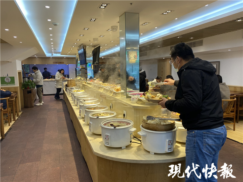 雖然中午1點多,但在新街口一家自助快餐店仍然有不少顧客,上下兩層的四五十張餐桌幾乎都坐著客人,有的一桌三四人、有的一桌兩人,還有的顧客正在吧臺排隊選擇菜品。記者看到,店內(nèi)多處張貼著“17元現(xiàn)炒任意吃”的提示,在吧臺上擺放著包菜粉絲、雞腿、肉圓子、米飯和炒面等食物,店內(nèi)廣播則循環(huán)播放著“勤拿少取”的提醒。店長程先生說,“店內(nèi)有30多種菜品,每天還會更換五六種,平常店里多是在附近上班的人。”