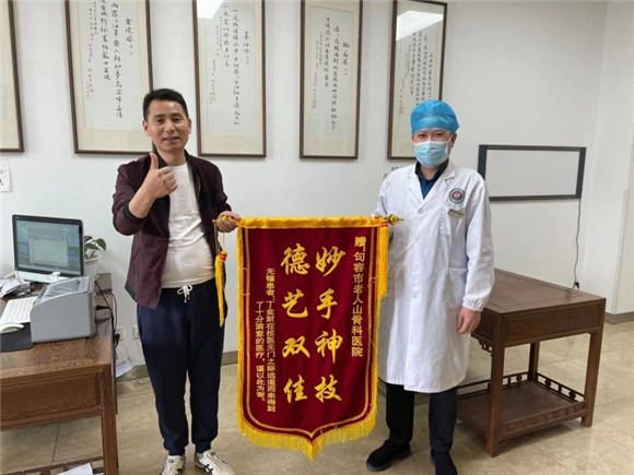 家住溧陽(yáng)的葉先生,2021年6月的一天,在采摘楊梅時(shí)不慎跌傷致左大腿腫脹、疼痛,不能站立行走,活動(dòng)后疼痛加重。經(jīng)朋友介紹來老人山醫(yī)院治療。7月1日進(jìn)行了左股骨中下段粉碎性骨折切開復(fù)位內(nèi)固定術(shù),術(shù)后恢復(fù)情況良好,一周后出院,返回家中靜養(yǎng),現(xiàn)在已完全康復(fù),高興之余,特地讓家人給程保加主治醫(yī)師送來錦旗,上寫:“程氏骨科,名不虛傳!”