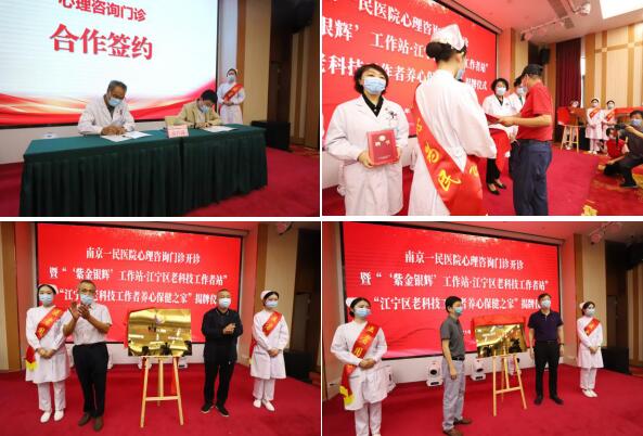 隨后,現(xiàn)場進行了南京一民醫(yī)院心理咨詢門診簽約儀式及南京一民醫(yī)院心理咨詢門診開診暨“‘紫金銀輝’工作站·江寧區(qū)老科技者工作站”“江寧區(qū)老科技工作者養(yǎng)心保健之家”揭牌儀式。南京市江寧區(qū)老科技工作者協(xié)會會長陳央保、南京一民醫(yī)院黨總支書記、董事長劉大林共同為“紫金銀輝”工作站·江寧區(qū)老科技者工作站揭牌;南京市江寧區(qū)科學技術(shù)協(xié)會副主席馬明星、南京市江寧區(qū)心理學會副理事長、南京醫(yī)科大學馬克思主義學院院長、教授鄭愛明共同為“江寧區(qū)老科技工作者養(yǎng)心保健之家”揭牌,并由江寧區(qū)老科技工作者協(xié)會副會長龐聲凱頒發(fā)聘書。最后,在南京一民醫(yī)院工作人員的帶領(lǐng)下,活動參與人員共同參觀醫(yī)院,并合影留念。