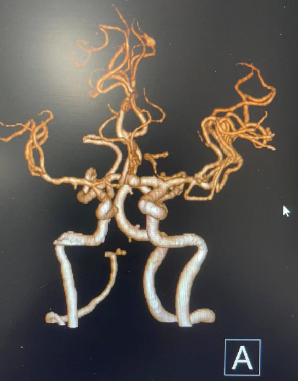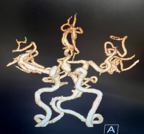 隨后,患者來到江寧醫(yī)院神經(jīng)外科就診,接診醫(yī)生閱片后發(fā)現(xiàn),該占位表面比較光滑,內(nèi)部有漩渦狀的不規(guī)則增強(qiáng)信號(hào)和血管流空影,考慮動(dòng)脈瘤可能性大,予以CTA檢查,最終確診為巨大前交通動(dòng)脈瘤,需要進(jìn)行手術(shù)治療。