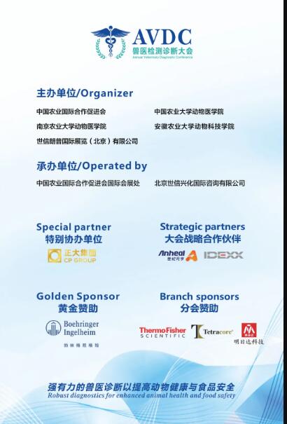 本次大會(huì)由中國(guó)農(nóng)業(yè)國(guó)際合作促進(jìn)會(huì)、中國(guó)農(nóng)業(yè)大學(xué)動(dòng)物醫(yī)學(xué)院、南京農(nóng)業(yè)大學(xué)動(dòng)物醫(yī)學(xué)院、安徽農(nóng)業(yè)大學(xué)動(dòng)物科技學(xué)院、世信朗普國(guó)際展覽(北京)有限公司主辦;由中國(guó)農(nóng)業(yè)國(guó)際合作促進(jìn)會(huì)國(guó)際會(huì)展處和北京世信興化國(guó)際咨詢公司承辦;正大集團(tuán)為特別協(xié)助單位,世紀(jì)元亨和愛(ài)德士為戰(zhàn)略合作伙伴單位和贊助,勃林格殷格翰為黃金贊助,賽默飛、泰吉科和明日達(dá)科技為分會(huì)贊助。