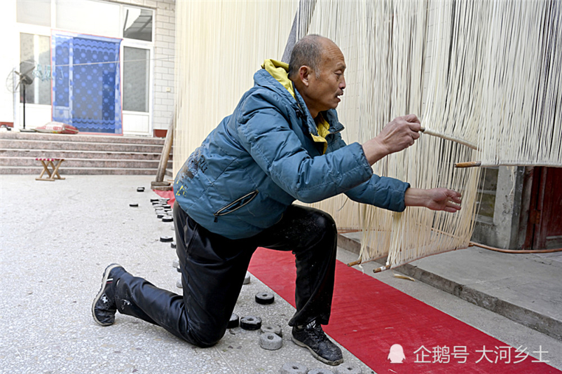 圖為陳世民跪在地上將掛面拉展 圖源:大河鄉(xiāng)土企鵝號