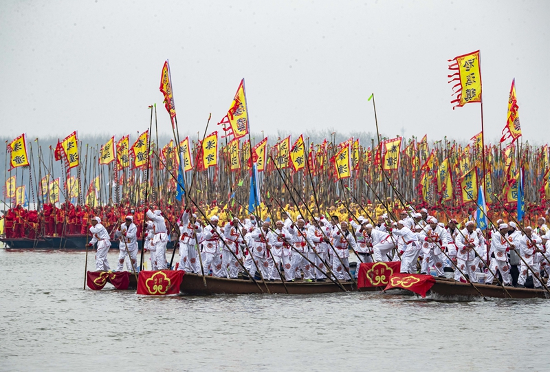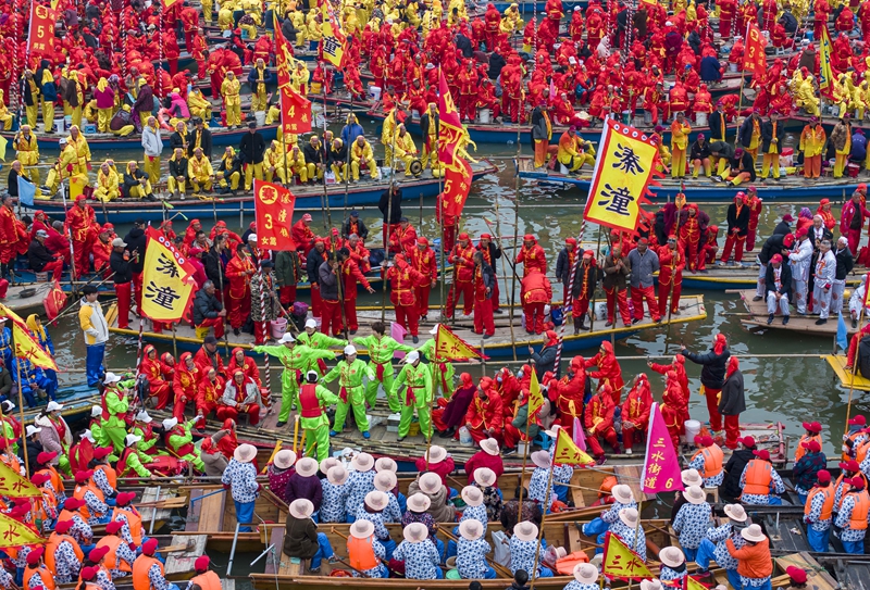 當(dāng)日,2024年泰州姜堰溱潼會船在江蘇省泰州市姜堰區(qū)溱湖國家濕地公園開幕,數(shù)百條各式各樣的船只和上萬名會船選手云集溱湖,飛篙走槳,奮勇爭先,呈現(xiàn)“千篙萬槳鬧溱湖 百舸爭流逐春潮”的壯觀場景,演繹歷久彌新的民俗畫卷。溱潼會船由南宋相沿至今,歷經(jīng)數(shù)百年傳承,被列入國家級非物質(zhì)文化遺產(chǎn)名錄。