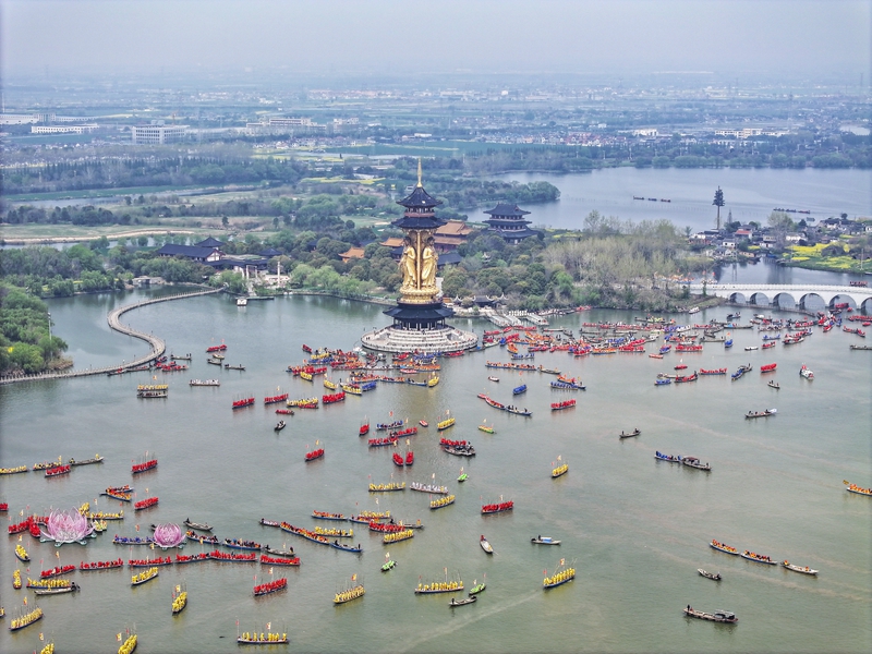 4月6日拍攝的溱潼會船現(xiàn)場(無人機照片)。新華社發(fā)(顧繼紅?攝)