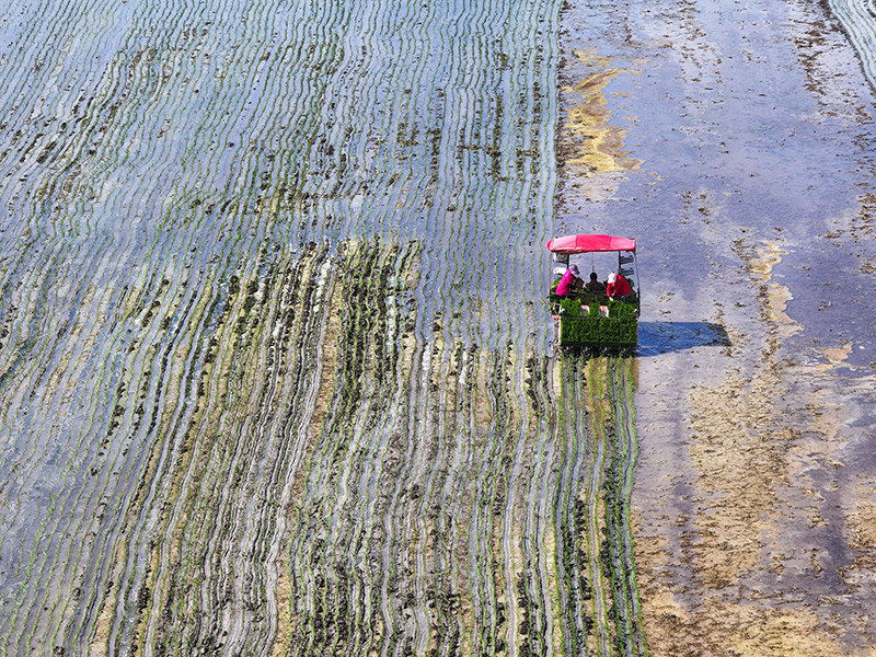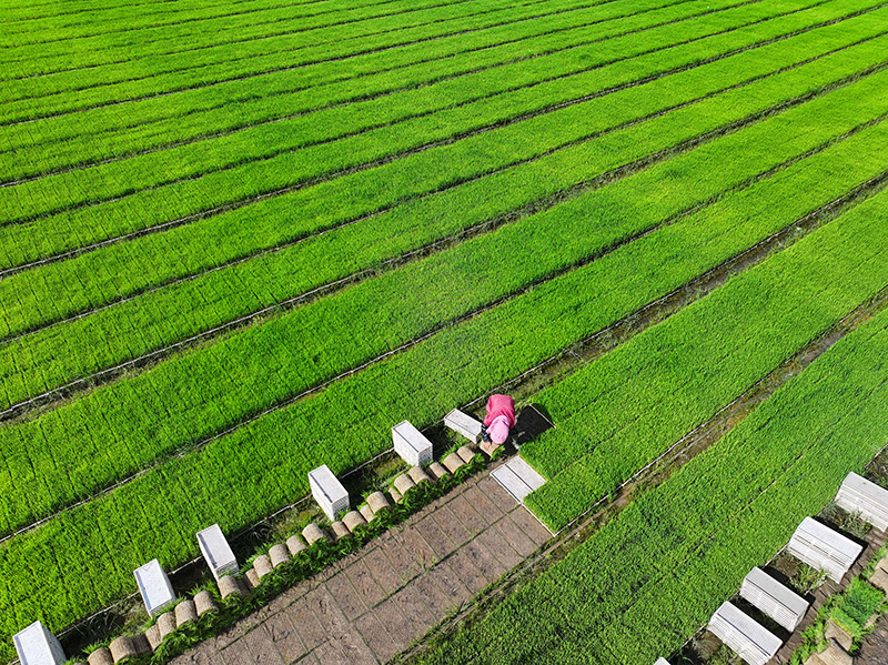 “三夏”時節(jié),位于江蘇省鹽城市射陽縣的江蘇農(nóng)墾臨海農(nóng)場搶抓農(nóng)時,開展機械化插秧作業(yè)。農(nóng)人、農(nóng)機、風車在藍天白云映襯下,構(gòu)成一幅幅美麗的鄉(xiāng)村圖畫。據(jù)了解,今年臨海農(nóng)場水稻種植面積8.4萬余畝,目前插秧作業(yè)已完成過半。