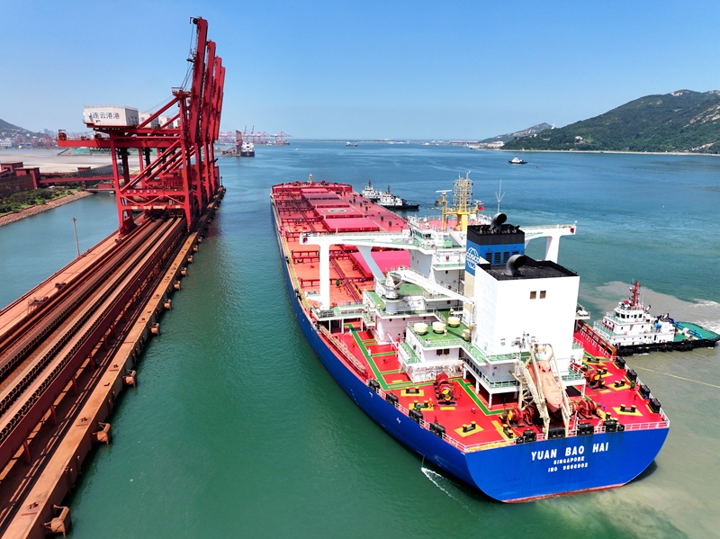 8月12日,從巴西駛來的滿載40萬噸鐵礦石的新加坡籍“遠寶?!陛喛坎唇K省連云港新蘇港碼頭。該輪長362米、寬65米,是今年以來靠泊連云港的第15艘40萬噸級貨輪。新華社發(fā)(王春?攝)