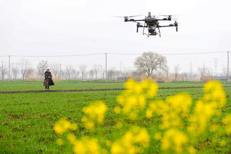 3月5日,在江蘇省興化市陳堡鎮(zhèn)蔡堡村,種植戶使用植保無人機為小麥?zhǔn)┓省? 當(dāng)日是驚蟄,各地農(nóng)民搶抓農(nóng)時,田間地頭一派忙碌景象。 新華社發(fā)(周社根 攝)