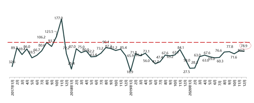 2020年12月汽車消費指數(shù)為78.9,與上月略有下降,基本處于相同水平。2020年終旺季汽車市場銷量快速增長,市場需求持續(xù)增長。