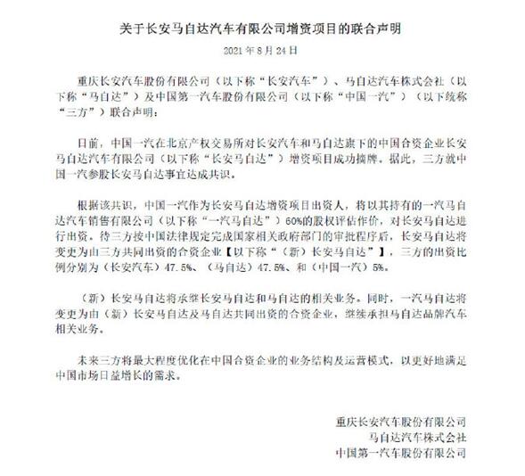 8月24日,長安汽車發(fā)布關(guān)于長安馬自達(dá)汽車有限公司增資項(xiàng)目的聯(lián)合聲明。