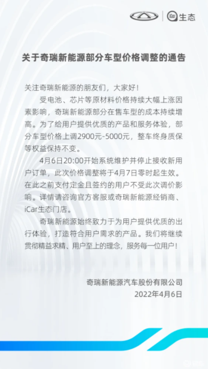 上調(diào)2900-5000元 奇瑞新能源部分車型4月7日起調(diào)價(jià)