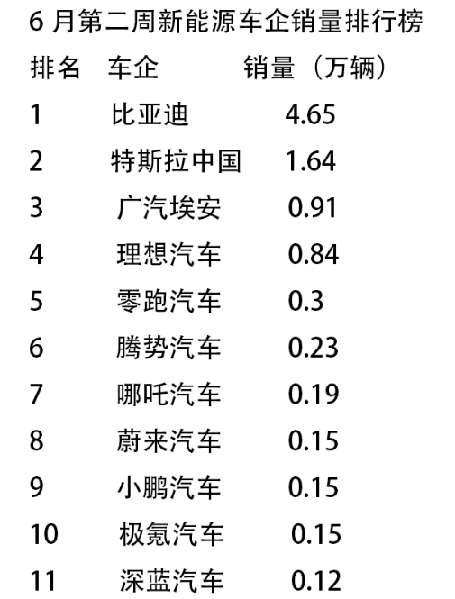 第一名依舊是比亞迪,6月第二周銷量4.65萬輛。只是這個(gè)成績對(duì)于比亞迪而言只能說是尚可,比亞迪還得接著發(fā)力。