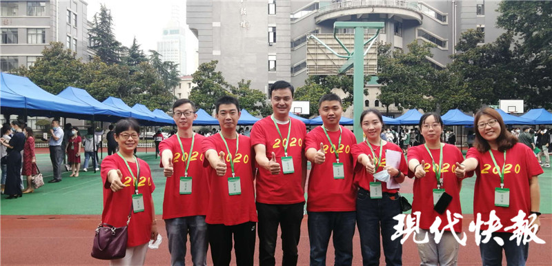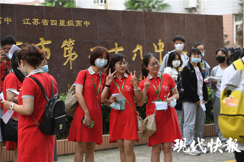 南京市金陵中學(xué)河西分??键c(diǎn)門口,來自幾所學(xué)校的考生分批有序進(jìn)場(chǎng)。送考老師和家長們穿上紅T恤、旗袍,用一個(gè)個(gè)大大的擁抱為學(xué)生們加油!