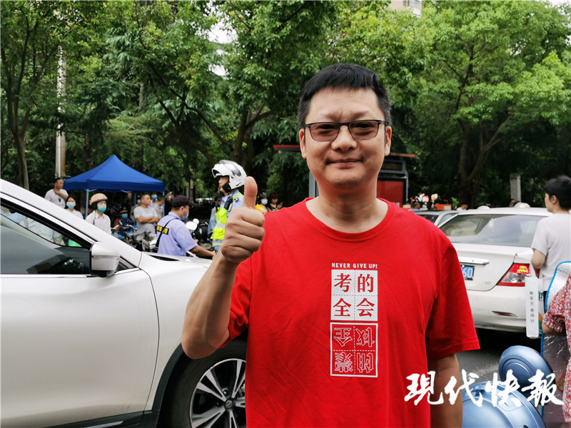 在南京市第二十九中學(xué)考點(diǎn)參加中考的考生,部分來自鼓樓實(shí)驗(yàn)中學(xué)。一對(duì)父母身穿紅色T恤,胸前寫著“考的全會(huì),蒙的全對(duì)”,吸引了不少人注意。“今天早上為了防止堵車,我和孩子?jì)寢屢粋€(gè)人騎電動(dòng)車,一人開車來送考,給孩子準(zhǔn)備雙保險(xiǎn)嘛。”送考的劉先生說,他們還是比較輕松的,今早為孩子準(zhǔn)備了紅豆糕等早點(diǎn),希望孩子可以在今天的考試中保持好心態(tài),取得好成績。