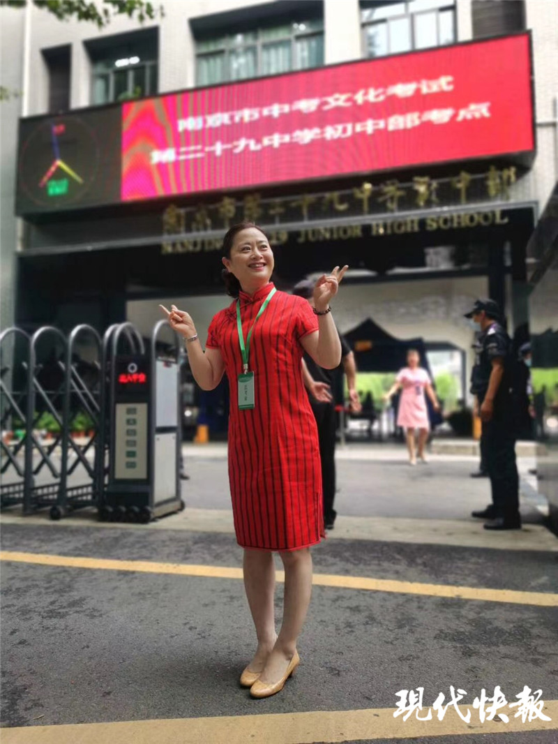 南京師范大學(xué)附屬中學(xué)樹人學(xué)校校長孫小紅,一早就來到南京市第二十九中學(xué)初中部考點(diǎn)送考。她特意穿上豎條紋的紅色旗袍,祝愿考生們考試順順利利。