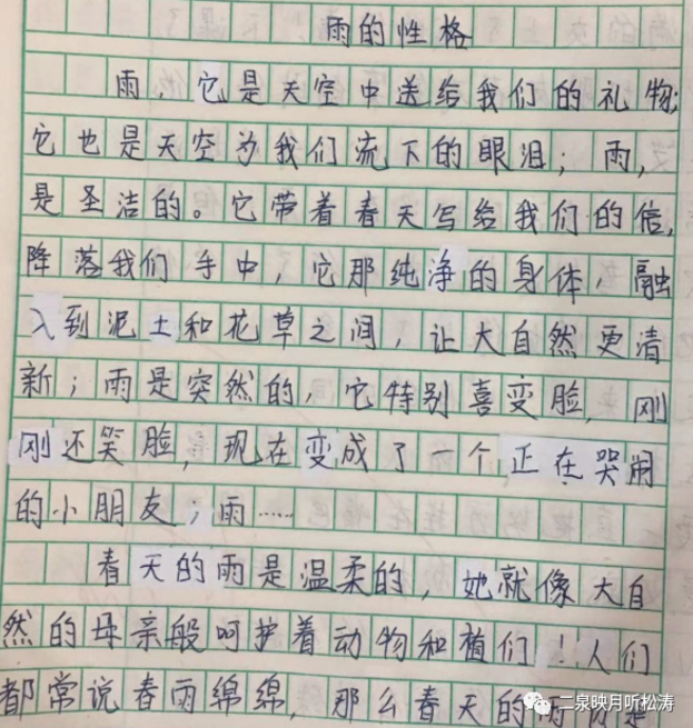 第二天,張心蕊在我的啟發(fā)之下寫出了《雨的性格》,她媽媽將這篇作文發(fā)到了我的微信中。