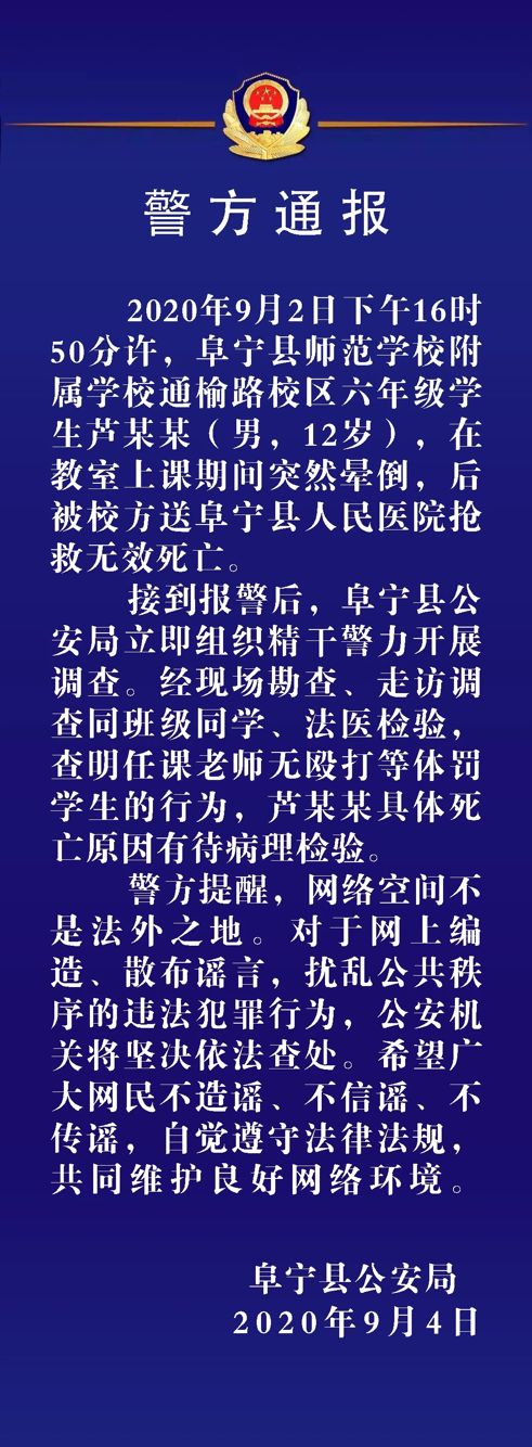 接到報警后,阜寧縣公安局立即組織精干警力開展調(diào)查。經(jīng)現(xiàn)場勘查、走訪調(diào)查同班級同學(xué)、法醫(yī)檢驗(yàn),查明任課老師無毆打等體罰學(xué)生的行為,蘆某某具體死亡原因有待病理檢驗(yàn)。