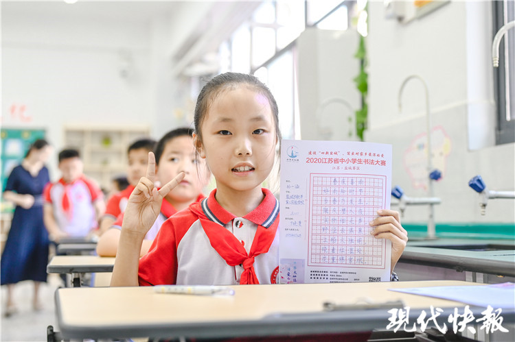 提按轉折,頓挫成峰,專注的字,專注的眼神……當天,現(xiàn)代快報記者在現(xiàn)場看到,學校兩間書法教室坐滿了學生,他們有的是參加軟筆比賽,有的用硬筆書寫。教室里,校長祝成榮和幾名老師有序地指導著,提醒學生端正握筆,正確坐姿。