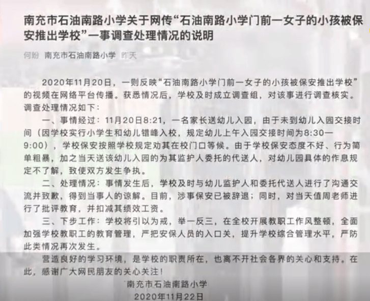 目前,涉事保安已被辭退,同時對當(dāng)天值周老師進(jìn)行了批評教育,并扣減其績效工資。