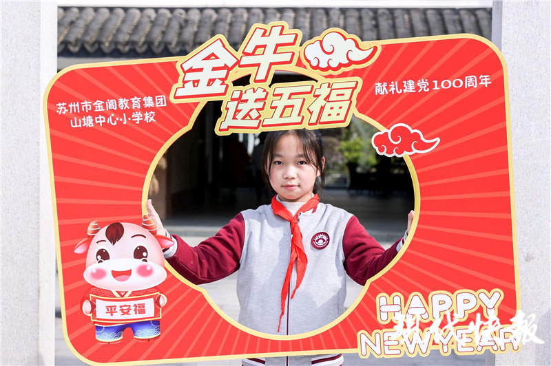 2月22日上午8點20分,一場別開生面的開學典禮在蘇州市金閶實驗小學的操場上舉行,百名師生齊上陣拼成了一個“牛”字,每個人手上拿著一幅自己親手寫的福字,從高處俯看,一個超級大的“福牛”喜氣盈盈。