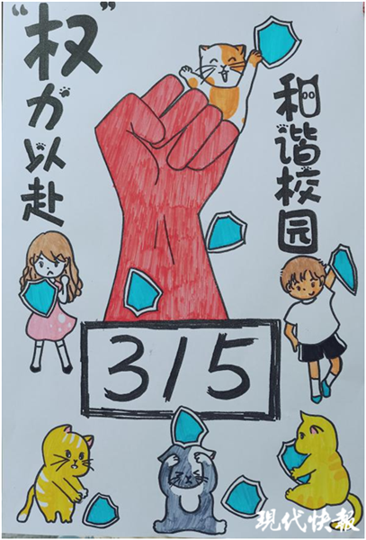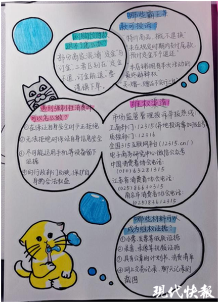 國際經(jīng)貿(mào)學(xué)院的同學(xué)們開展了“和諧校園,‘權(quán)’力以赴”主題活動,手繪出生動形象的消費(fèi)者維權(quán)知識宣傳單。宣傳單的正中是一只拳頭,象征著消費(fèi)者的“權(quán)”力。四周可愛的“國小貓”則是國貿(mào)院學(xué)子的象征。宣傳單的背面寫有“網(wǎng)購預(yù)付款退不了怎么辦”“哪些霸王條款可投訴”“哪些材料可以成為維權(quán)證據(jù)”等熱議話題,并給出了詳細(xì)解答,活動豐富了同學(xué)們有關(guān)消費(fèi)者權(quán)益的知識。