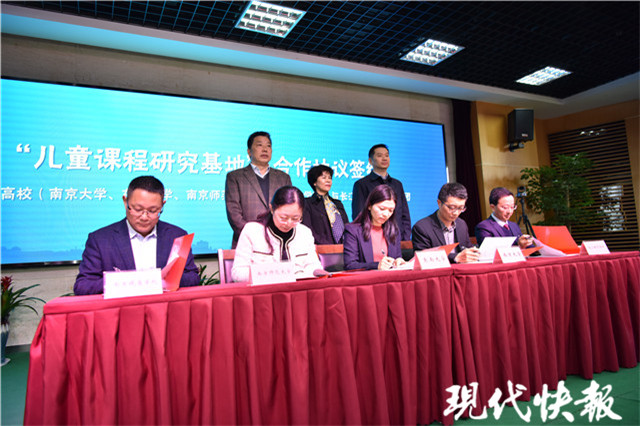 儀式上,南京大學(xué)、東南大學(xué)、南京師范大學(xué)、南京曉莊學(xué)院四所高校與長(zhǎng)江路小學(xué)教育集團(tuán)簽訂合作協(xié)議。四所高校為長(zhǎng)江路小學(xué)教育集團(tuán)“課程研究基地”授牌:南京大學(xué)心理健康教育與研究中心授牌“兒童心理健康教育課程研究基地”,東南大學(xué)電子科學(xué)與工程學(xué)院授牌“兒童科學(xué)技術(shù)教育課程研究基地”,南京師范大學(xué)文學(xué)院授牌“小學(xué)語文課程研究基地”,南京曉莊學(xué)院教師教育學(xué)院授牌“小學(xué)數(shù)學(xué)課程研究基地”。