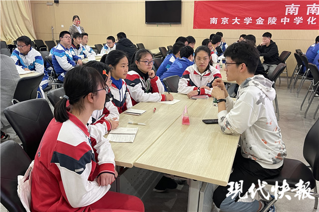 現(xiàn)場,包括金中校友戴飛在內(nèi)的南大化學(xué)化工學(xué)院學(xué)生代表,就化學(xué)競賽與金中化競班學(xué)生交流討論。