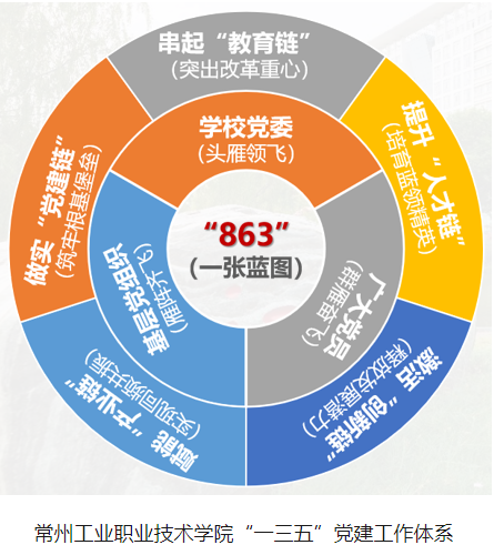 常州工業(yè)職業(yè)技術(shù)學院黨委不斷豐富“一三五”黨建工作體系內(nèi)涵,相繼推出《常州工業(yè)職業(yè)技術(shù)學院關(guān)于進一步推進新時代黨建示范創(chuàng)建和質(zhì)量創(chuàng)優(yōu)工作的實施意見》《常州工業(yè)職業(yè)技術(shù)學院關(guān)于實施“一三五”黨建工作體系的方案》《常州工業(yè)職業(yè)技術(shù)學院先鋒人物評選辦法》《“新能紅盟”行動——打造常州工業(yè)職業(yè)技術(shù)學院基層黨組織新能源黨建品牌建設項目實施方案》等黨建創(chuàng)新創(chuàng)優(yōu)舉措,將“加強黨的建設”融入高水平高職學校建設方案,以政治建設統(tǒng)領黨對學校工作的全面領導,持續(xù)開展以“八大工程”“六大重點項目”“三十個核心指標”為抓手的重點計劃,立足“學校黨委—基層黨組織—全體黨員”三級框架,精準實施“頭雁領飛”“雁陣齊飛”“群雁奮飛”的三“飛”工程,開展“先鋒人物”評選,強化先鋒引領,以“新能紅盟”等譜系化黨建品牌建設為載體促進“五鏈耦合”,用“黨建鏈”串起具有高職教育類型特征的“教育鏈”,從而提升行業(yè)和企業(yè)急需的“人才鏈”、激活地方院校技術(shù)技能積累的“創(chuàng)新鏈”、賦能城市發(fā)展的“產(chǎn)業(yè)鏈”,推進“城產(chǎn)教科創(chuàng)”融合發(fā)展。