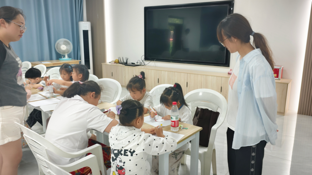 宣講結束后,團隊成員一起幫助小朋友們描摹對綠色生活的展望,用畫筆繪就低碳日常,用貼紙彰顯環(huán)保理念,將奇思妙想變成保護生態(tài)環(huán)境的畫面。