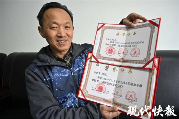 近20年來,許光文多次獲得全國無償獻血奉獻獎金、銀、銅等獎項,這些榮譽對于他來說,是鼓勵,更是動力。“我肯定會一直堅持下去,盡一點力,多幫幫有需要的人,這是應該做的。”