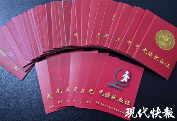 當許光文拿出自己的獻血證時,40多本獻血證攤開來滿滿當當?shù)劁伭艘蛔雷印,F(xiàn)代快報記者了解到,近20年來,許光文堅持每年獻血,如今已無償獻血56次,獻血量累計達到9000余毫升,遠遠超出一個成年人全身血液的總量。