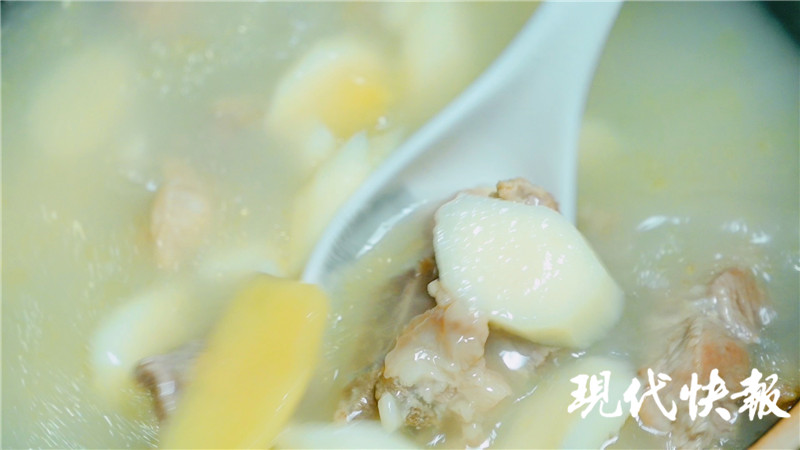 給山藥削皮、把雞蛋打散,劉康一看就是個熟手。不到一會兒,一盤黃瓜火腿腸炒雞蛋上桌了,賣相很好看。燉好的排骨湯和炒菜一一裝盤,時間剛好是17點40分,“傍晚6點鐘能趕到醫(yī)院。”他說。